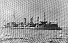 In 1908, when she was assigned to 3rd Division of the Northern Squadron, along with the cruiser Descartes and the armored cruiser Kléber. By that time, the squadron included another seven armored cruisers and two other protected cruisers.[15][16] The ship was reduced to a hulk in 1911,[3] and was disarmed two years later. During World War I, she was used as a water distilling ship based in Mudros during the Gallipoli campaign and later with the main fleet at Corfu.[5][17][18] She was then transferred to Port Etienne to supply the French colony with water in 1920. For budgetary reasons, the Ministry of the Navy decommissioned the cruiser and sold her to the French fishery "Société Industrielle de la Grande Pêche" in 1921.[19][20] She was used as a floating warehouse and as a cistern for drinking water brought once a month from the Canary Islands.[21] She was ultimately sunk in 1926 and became the first ship to be abandoned in the bay of Nouadhibou, Mauritania.[22][23][24][25]