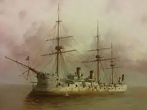 ![]() Detail of "The Duquesne" (1903), painting of the twenty-one gun French iron-hulled cruiser, by Henry E. Traumer, on display at the Duquesne Club, Pittsburgh, Pennsylvania. | |