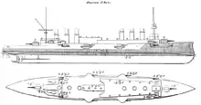 Jeanne d'Arc was originally conceived in the early 1890s as a large protected cruiser for overseas service, but the design was recast as an armoured cruiser by the naval architect Emile Bertin, director of the Navy's Technical Section (Section technique) in 1895.[1] His design is regarded as unsuccessful with too light an armament for her size and failing to achieve her designed speed.[2][3] The ship measured 147 metres (482 ft 3 in) long overall with a beam of 19.42 metres (63 ft 9 in) and had a maximum draught of 8 metres (26 ft 3 in). She displaced 11,264 tonnes (11,086 long tons) at normal load and had a metacentric height of 1.458 metres (5 ft). The hull was subdivided by 15 watertight bulkheads that extended from her double bottom to the main armoured deck.[4] Jeanne d'Arc had a crew of 651.[3]