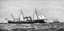 The ship was propelled by a pair of horizontal compound steam engines, each driving a screw propeller. Steam was provided by twelve coal-burning water-tube Belleville boilers that were ducted into two raked funnels located amidships.[6] Water-tube boilers were a recent development, and they allowed the ship to get steam up and accelerate much faster than older fire-tube boilers.[7] The boilers were placed on the centerline amidships, and the coal bunkers were arranged above them, allowing the coal to be fed by gravity, significantly reducing the stoking work required.[8] To supplement her steam engines, she was fitted with a three-masted, fore-and-aft schooner rig.[6]