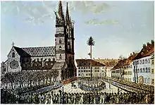 The first event of what would become known as the "Helvetic Revolution" happened with a patriot uprising in Liestal in the Canton of Basel on 17 January. The rebels demanded legal equality, erected a liberty tree and burnt down three Vogtei castles by 23 January.[3] On 24 January 1798, the urban elite of Vaud proclaimed the Lemanic Republic (French: République lémanique)[4] in Lausanne, which became its seat of government.[5] Next, citizens and subjects in countless Swiss cities, cantons and their dependencies rebelled, and after the example of Vaud, more than 40 other short-lived republics were proclaimed in February, March and April throughout the country.[1]