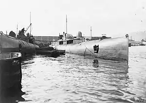 The French Navy in the Mediterranean, 1914-1918 French submarines DUPUY DE LOME and SANE in harbour, probably in Toulon.