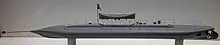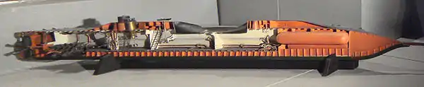 The submarine used a compressed-air engine, propelled by stored compressed air powering a reciprocating engine.[3] The air was contained in 23 tanks holding air at 12.5 bar (1.25 MPa, 180 psi), taking up a huge amount of space (153 m³/5,403 ft³), and requiring the submarine to be of unprecedented size. The engine had a power of 60 kW (80 hp), and could propel the submarine for 5 nmi (9 km), at a speed of 4 kn (7.2 km/h).