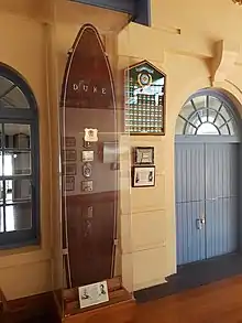 A visit from Duke Kahanamoku (US Olympian and surfer) in 1914 helped contribute to the rise in popularity of surfing. Many riders copied his style of wooden board and, in 1952, Duke donated one of his boards to the Freshwater SLSC, where it remains a vital part of Australian surfing history.[5]
