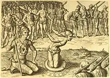 Agua Dulce or Agua Fresca (both meaning "Freshwater") was a Spanish term for Timucua living along the freshwater lower St. Johns River, as opposed to the Mocama or "Salt Water" who lived along the coast.[1] The Utina chiefdom of the late 16th century is so called after its paramount chief at the time of contact with the Europeans, Olata Ouae Utina; other spellings of the name include "Outina". The name "Utina" does not appear to be a designation specific to this group; uti-na means "my land" in Timucuan.[2] The Saturiwa, another Timucua chiefdom who were enemies of the Utina, called them "Thimogona" or "Tymangoua", which is possibly the origin of the name "Timucua".[2] The French followed the Saturiwa in this use, but later, the Spanish used the word "Timucua" for a much wider area of northern Florida, which they incorporated into their mission system as the Timucua Province.[2]