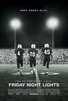 Friday Night Lights is a 2004 American sports drama film co-written and directed by Peter Berg. The film follows the coach and players of a high school football team in the Texas city of Odessa, which supported the team and was obsessed with them. The book on which it is based, Friday Night Lights: A Town, a Team, and a Dream (1990) by H. G. Bissinger, followed the story of the 1988 Permian High School Panthers football team as they made a run towards the state championship. A television series of the same name premiered on October 3, 2006 on NBC. The film won the Best Sports Movie ESPY Award and was ranked number 37 on Entertainment Weekly's list of the Best High School Movies.[1][2]