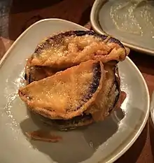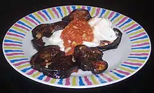 Fried eggplant (Turkish: Patlıcan kızartma[4] or Patlıcan kızartması[5][6]) is found in Turkish cuisine. It is such a common dish during summer months that this season used to be called patlıcan kızartma ayları (fried eggplant months)[7] in Ottoman Istanbul, where this generalized frying caused huge fires and destroyed entire mahalles due to the abundance of old wooden houses.[8][9] The dish is usually eaten with a garlic yogurt or tomato sauce.