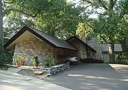The house was designed in Wright's post-World War II Usonian architecture, with the goal of "affordable, beautiful housing for a democratic America." The L-shaped, one-story home's floor plan features a dominant living room and social and spatial separation into "active" and "quiet" areas.[4] The short side of the L consists of the "active" portion, centering on a living room with 17-foot (5.2 m)-high vaulted ceiling and views of Cedar Lake; the "quiet" portion is the long side ending in a three-car carport and has bedrooms as well as a gallery leading to a hidden main entrance.[1]