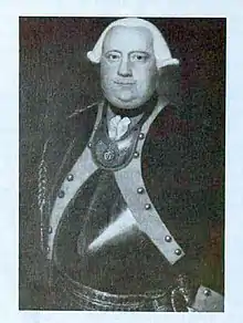 Friedrich August Valentin Voit von Salzburg (1734-1798) was a commander of military units from Ansbach-Bayreuth. During the American Revolutionary War, the Kingdom of Great Britain purchased the services of soldiers from various German princes. Voit commanded the First Regiment of the Ansbach Regiment led by Friedrich Ludwig Albrecht von Eyb, designated the Voit Regiment. In May 1778, Eyb left and Voit took charge of the regiment. Also, he was in command of all Ansbach troops in North America by the time the war had ended.[1]