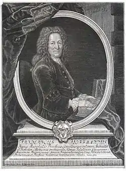 In 1693, shortly after the establishment of the University of Halle, he was appointed primary professor of medicine and natural philosophy. During his career there, he held the position of rector three times. With the exception of four years (1708–1712), which he passed at Berlin in the capacity of royal physician, Hoffmann spent the rest of his life at Halle in instruction, practice and study, interrupted now and again by visits to different courts of Germany, where his services procured him honours and rewards.[1] His fame became European. He was enrolled a member of many learned societies in different foreign countries (including being elected Fellow of the Royal Society in 1720),[2] while in his own he became privy councillor.