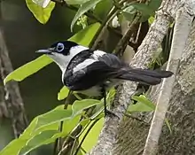 The frill-necked monarch is a member of a group of birds termed monarch flycatchers. This group is considered either as a subfamily Monarchinae, together with the fantails as part of the drongo family Dicruridae,[4] or as a family Monarchidae in its own right.[5] Molecular research in the late 1980s and early 1990s revealed the monarchs belong to a large group of mainly Australasian birds known as the Corvida parvorder comprising many tropical and Australian passerines.[6] More recently, the grouping has been refined somewhat as the monarchs have been classified in a 'Core corvine' group with the crows and ravens, shrikes, birds of paradise, fantails, drongos and mudnest builders.[7]