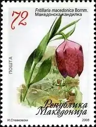 - Universal Postal Union, Flora of Macedonia - Endemic Species - Fritillaria macedonica Bornm photo of Macedonian postage stamp featuring color depiction of Fritillaria macedonica