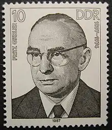 Fritz Gäbler (1897 – 1974) was an East German communist politician. In 1932, he was a representative in the Thuringia state parliament. Gäbler was imprisoned for most of the Nazi era, having been one of the first prisoners in Nohra concentration camp.[1] After the war, he became a member of the Socialist Unity Party of Germany, where he was chairman of the SED Central Revision Commission.[2] In 1987 he was commemorated by having a stamp designed with his face on it, in East Germany.[3]