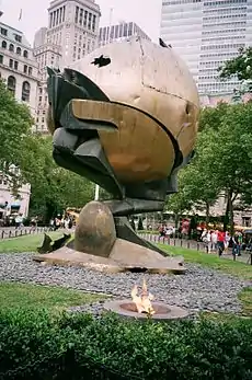 Koenig's main work and most famous work is The Sphere. The world's largest bronze sculpture of modern times once stood on the plaza beneath the two World Trade Center towers in Lower Manhattan until the terrorist attacks on September 11, 2001.[1] The artifact, weighing more than 20 tons, was the only remaining work of art to be recovered largely intact from the ruins of the collapsed twin towers after the attacks. With its damage deliberately left unrepaired, the sculpture now stands in Manhattan's Liberty Park as a memorial to the victims of the September 11 attacks.