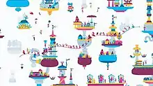 Hohokum is an art game[3] developed by British game developer Honeyslug in collaboration with artist Richard Hogg and Santa Monica Studio[12] beginning in 2008.[13] Hogg and Honeyslug's Ricky Haggett knew each other through a music connection. The two discussed making a game and began to collaborate when Hogg sent images to Haggett, who was experimenting with Adobe Flash. They prototyped a top-down game similar to Flow as well as a platformer with a jetpack, and a mini-golf game.[14] Their first formal collaboration was an entry for Kokoromi's Gamma event in Montreal.[6][lower-alpha 1] The team's first game ideas for Hohokum were about racing, which grew into the idea of a "stunt kite".[13] They wanted to make a game with the limitations and satisfaction of flying a kite[8] where the conventional aims of video games were absent: no being commanded, avoiding failure, or being challenged to advance.[12] The gameplay was designed to encourage expressive play and experimentation[6] as "a playground, a place to wander about".[12] Santa Monica Studio's lead game designer of external games Seth Killian described that world's nature as "about a feeling and a mood, a mental space".[10] The first pieces of the game were abstract, and the development gradually grew figurative, with people and buildings.[15] In pre-production, Richard Hogg and Ricky Haggett went to free London museums, such as the National Maritime Museum, Natural History Museum, Imperial War Museum, which inspired in-game content like ancient Egyptian tombs.[15] The game's "Fun Fair" level was based on Portmeiron in North Wales,[16] and they were also inspired by the festival costumes of the Selknam people of southern Argentina.[17]