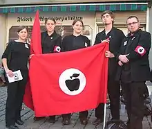 The Front Deutscher Äpfel (short F.D.Ä.; German for Front of German Apples), also called Apfelfront (Apple Front) is a satirical organisation, founded in Leipzig in 2004. It satirizes right extremist parties, especially the Nationaldemokratische Partei Deutschlands (NPD). In the style of former and existing right extremist organisational structures it is subdivided into numerous sub-groups like the youth organisation Nationales Frischobst Deutschland (NFD; National Fresh Fruit of Germany), the women's organisation Bund weicher Birnen (B.W.B.; League of Soft Pears, compare League of German Girls; Birne, pear, is a German colloquial term for head, "eine weiche Birne haben" ("to have a soft pear"), is synonymous to "being very stupid") and many further local Gaue.