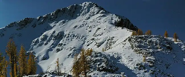 Frosty Mountain is a 2,426-metre (7,959-foot) mountain summit located in the Canadian Cascades of southwestern British Columbia, Canada. It is situated 4 km (2 mi) south of Lightning Lake, 1.3 km (1 mi) north of the Canada–United States border, and 3.6 km (2 mi) north-northeast of Castle Peak, which is its nearest higher peak. Frosty Mountain is the highest peak in E. C. Manning Provincial Park, and is part of the Hozameen Range which is a subrange of the Cascade Range.[2] It has a lower elevation subsidiary peak known as Frosty Mountain East (2409 m) which is labelled as Frosty Mountain on some maps.[3] The Frosty Mountain name was officially adopted on March 31, 1924, by the Geographical Names Board of Canada.[4][5] The peak was first climbed on September 2, 1904, by Sledge Tatum and George Loudon Jr., two members of a Boundary Survey group led by Edward C. Barnard.[1] Precipitation runoff from the peak drains into headwaters of Frosty Creek, as well as other tributaries of the Similkameen River.