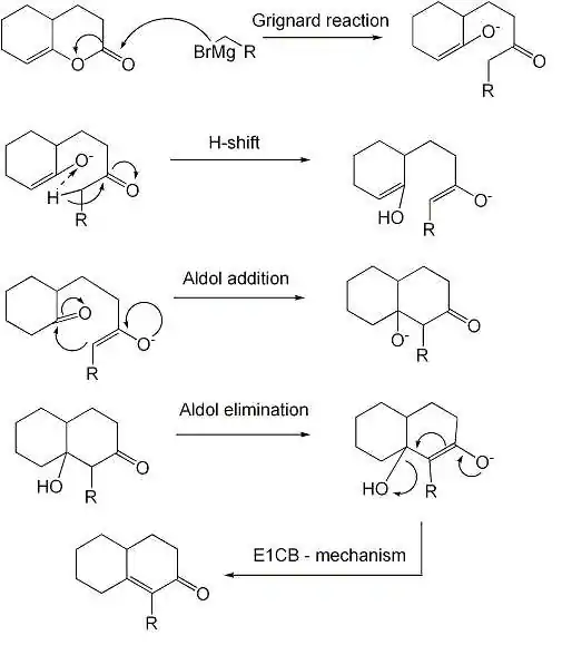 The reaction is a Grignard reaction, followed by a H-shift, an enol-keto tautomerisation and an Aldol addition reaction. The last step is an elimination (Aldol condensation) reaction with an E1CB mechanism.