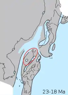 ![]() Map showing hypothesized paleodistribution of the genus Fukuia (Fukuia integra, Fukuia kurodai and Fukuia multistriata) in the Early Miocene (23-18 Ma). |