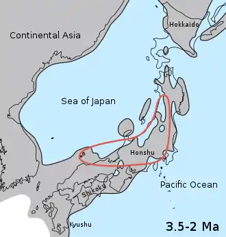 ![]() Map showing hypothesized paleodistribution of the genus Fukuia in the Middle Pliocene to Late Pliocene (3.5-2 Ma). |