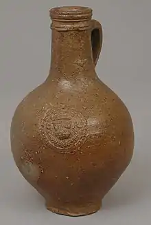 After Dwight died in 1703, the business continued under his daughter and later other members of the family, but the range and quality of wares declined, and (at least the survivals) are mostly "tavernware": bottles, jugs, mugs and the like, many with relief decoration (hunting scenes appealed to the tavern market) and inscribed or impressed inscriptions, the latter using printer's type.[17] A relief moulded mug shown below has a version of William Hogarth's print Midnight Modern Conversation,[18] a satirical drinking scene, and "a very popular subject found on mugs and jugs of this type", above the inevitable hunting scene. The stamped inscription "Richd – Turner; Three Sugar – Loaves (across the medallion); Rickmansworth Herts (below)" shows it was made for Richard Turner, landlord of the "Three Sugar Loaves" inn in Rickmansworth, Herts.[19]