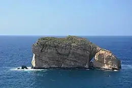 Fungus Rock, sometimes known as Mushroom Rock,[2] and among the Maltese as Il-Ġebla tal-Ġeneral (English: The General's Rock), is a small islet in the form of a 60-metre-high (200 ft) massive lump of limestone at the entrance to an almost circular black lagoon in Dwejra, on the coast of Gozo, itself an island in the Maltese archipelago. It is located at 36°02′45″N 14°11′27″E and falls within the jurisdiction of the town of San Lawrenz.