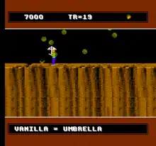 Though the player directly controls the boy, Blobert is controlled by the computer AI. The player must rely on the shapeshifting blob to cross gaps, reach higher platforms, and overcome the obstacles and enemies.[3][4][5] Blobert can change into several different tools when the player feeds him flavored jelly beans. A licorice jelly bean, for instance, will change Blobert into a ladder, while an apple jelly bean will turn him into a jack.[3][5] Whistling at Blobert causes him to revert to his original shape and continue following the boy.[4] The player is encouraged to experiment with the jelly beans and their effects to navigate the puzzling game world.[3][4] Scattered throughout Earth's caverns are various treasures and diamonds that increase the player's score and can be used to purchase vitamins at a drugstore located within the game world.[3][4] Vitamins can be used in conjunction with a special "VitaBlaster" gun, which is in turn used on Blobolonia to complete certain tasks.[5] Also found on the map are extra jelly beans and peppermints, which increase the player's lives.[4]