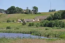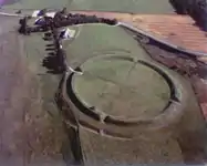 In 1993 the visitor centre of Viking Center Fyrkat was built about one kilometre from the ring fort. The center resembles a large Viking farm, with a big longhouse, a smithy, a barn and some smaller buildings including exhibition buildings and a museum shop - nine buildings all in all. The center has an educational focus and aims at presenting a complete Viking Age environment here on the model of a supplier for the fort. This includes regular re-enactments and various activities involving curious and willing visitors. No Viking farm has been found near the ring fort of Fyrkat, the buildings have been reconstructed after excavated examples in Vorbasse, a small town in southern Jutland.[5][6]
