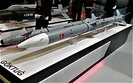 GÖKTUĞ is a Turkish program by TÜBİTAK-SAGE to develop four variants of air-to-air missiles that are to be launched from F-16s as well as future Turkish indigenous Hürjets and TF-Xs. These missiles are going to be Turkey's first indigenous air-to-air missiles.[1][2] Bozdoğan (Merlin) are short-range infrared homing and Gökdoğan (Peregrine) are beyond visual range active radar homing missiles.[3] Both missiles were successfully flight-tested in 2018.[4] The missiles are also planned to be integrated on Bayraktar AKINCI and Bayraktar MIUS, indigenously developed Turkish UCAVs.[5]