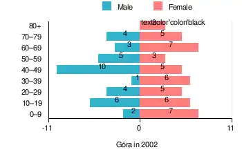 According to the 2002 Poland census, there were 82 people residing in Góra village, of whom 42.7% were male and 57.3% were female. In the village, the population was spread out, with 23.2% under the age of 18, 25.6% from 18 to 44, 28% from 45 to 64, and 23.2% who were 65 years of age or older.[1]