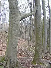 The bedrock of the Göttingen Forest area is mainly made up of layers of middle Triassic Muschelkalk. In the incisions made by the Lutter and Braten valleys there are deposits from the Pleistocene and Holocene epochs. The largest and highest-lying part of the forest, namely the plateau-like areas of the northern Plessforst from the Hünstollen to Plesse Castle and the eastern part from the Lengderburg in the south via the Mackenröder Spitze to the Södderich, are characterised by layers of Lower Muschelkalk, whilst Trochitenkalk and Ceratite layers of the Upper Muschelkalk are the predominant formations found in the central and western part of the forest that has undergone greater movement. Middle Muschelkalk is found in the transition areas. In the Lange Nacht region and the adjacent slopes of the Kleper there is an elongated trough of upper Triassic Keuper, and individual pockets of the Lower Keuper are also found in the southern part of the Göttingen Forest. To the north, east and south, regions of sandstone border on the forest. In the west there are Pleistocene silts and finally the Holocene water meadow loam of the Leine valley.[3] Many old quarries are located in the Trochitenkalk and Lower Muschelkalk in which limestone, the main building material for nearby settlements, was obtained. By contrast, the more thinly bedded and very brittle layers were just used as hard core for road building or to reinforce dirt tracks. The limestone areas of the Lower and Upper Muschelkalk are mostly covered with just a thin layer of humus which, even when weathered, do not support very fertile agricultural soils. Settlements were therefore established almost entirely in the areas where Middle Muschelkalk occurs which is also where several small springs rise.[1]