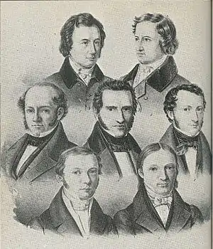 The Göttingen Seven (German: Göttinger Sieben) were a group of seven liberal professors from Göttingen.[2] In 1837, they protested against the abolition or alteration of the constitution of the Kingdom of Hanover by its new ruler, King Ernest Augustus, and refused to swear an oath to the king.[3][4] The company of seven was led by historian Friedrich Christoph Dahlmann,[5] who himself was one of the key advocates of the unadulterated constitution. The other six were the Germanist brothers Wilhelm and Jacob Grimm (famed fairy tale and folk tale writers and storytellers, known together as the Brothers Grimm),[6] jurist Wilhelm Eduard Albrecht, historian Georg Gottfried Gervinus, physicist Wilhelm Eduard Weber, and theologian and orientalist Heinrich Georg August Ewald.[1]