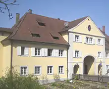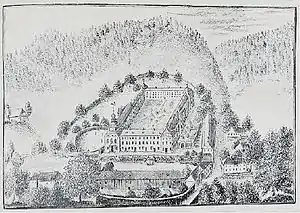 The company Friedrich Mez & Co., established on 1 June 1812, bought the principal conventual building along with the ancillary buildings and land on 5 September 1812 for 8,000 Gulden.[9] They constructed a cotton mill, which had to be auctioned off soon after, in 1817. The new owners, Benedict and Marquard von Hermann, then hired mainly children from the ages of 12-14 to work at the mill. In the night of 3–4 April 1829, the mill was burnt almost completely to the ground, among rumours of arson, perhaps even by the owner himself.[10] A reward was offered for any information relating to the crime.[11][12][13]