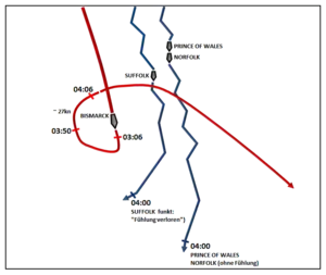 In May 1941, Lütjens commanded a German task force, consisting of the battleship Bismarck and the heavy cruiser Prinz Eugen, during Operation Rheinübung. In a repetition of Berlin, Lütjens was required to break out of their naval base in occupied Poland, sail via occupied Norway, and attack merchant shipping. The operation went awry and the task force was soon spotted and engaged near Iceland. In the ensuing Battle of the Denmark Strait, HMS Hood was sunk and three other British warships were forced to retreat. The two German ships then separated. Three days later, on 27 May, Lütjens and most of the ship's crew lost their lives when Bismarck was caught and sunk.