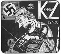 Strupp joined the Communist Party, which led to his arrest in 1933 after the Nazis seized power. He was held at Kemna concentration camp for several months,[1] an experience he later depicted in an illustration. Kiwitz was also arrested and placed in Kemna, but was later transferred to another concentration camp.[3] After his release in 1933, he fled to Paris,[4] where he stayed until 1936. In 1940, he applied for work building stage sets at several theaters in Berlin and with the help of Wilhelm Fraenger, found work painting scenery at the Schiller Theater. Fraenger also commissioned Strupp to illustrate Ludwig Tieck's Merkwürdige Lebensgeschichte Sr. Majestät Abraham Tonelli, but its publication was forbidden by the Reichskulturkammer.[1] It was eventually published after the war.