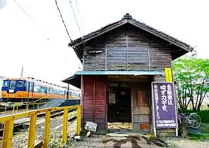 The station has a single island platform connected to a rustic wooden station building by a level crossing. The station is unattended.
