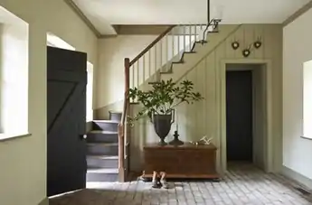 The Georgian farmhouse Boxwood (Nashville, 2010) involved working on a residence designed by one of Schafer's influences, American classicist Charles A. Platt.[26] The renovation sought to restore the understated classical formality that had been diluted by significant alterations, while contemporizing the home with modern living space, decoration and detail.[8][43] On the exterior, the firm created a more unified aesthetic by redesigning a 1950s portico to match Platt's vision and painting the re-clad brick white.[8][26][62] Inside, it restored the loggia's French doors and eliminated outmoded barriers between utilitarian, formal public and informal areas by opening the space and adding enfilades.[8][43][63]