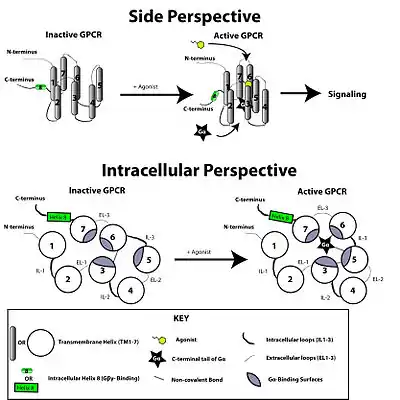 The G protein-coupled receptor is activated by an external signal in the form of a ligand or other signal mediator. This creates a conformational change in the receptor, causing activation of a G protein. Further effect depends on the type of G protein. G proteins are subsequently inactivated by GTPase activating proteins, known as RGS proteins.
