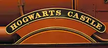 When filmed, Olton Hall carried a "Hogwarts Express" headboard on the smokebox, featuring the Hogwarts school crest. The same emblem is featured as part of the "Hogwarts Railways" sigil on the tender and carriages. It retained its GWR number of 5972, but with alternative nameplates fitted, naming the engine Hogwarts Castle. It is painted in a crimson livery — a non-standard colour, as GWR locomotives traditionally used green.[6]