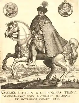 Gabriel was the elder of the two sons of Farkas Bethlen de Iktár and Druzsiána Lázár de Szárhegy.[1][2] Gabriel was born in his father's estate, Marosillye (now Ilia in Romania), on 15 November 1580.[1][2] Farkas Bethlen was a Hungarian nobleman who lost his ancestral estate, Iktár (now Ictar-Budinț in Romania), due to the Ottoman occupation of the central territories of the Kingdom of Hungary.[3] Stephen Báthory, Prince of Transylvania, granted Marosillye to him and made him captain-general of the principality.[4] Druzsiána Lázár was descended from a Székely noble family.[1][4] Both Farkas Bethlen and his wife died in 1591, leaving their two sons, Gabriel and Stephen, orphaned.[4]