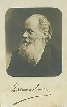 In 1894, due to suspicions about his involvement in the Lithuanian book smuggling activities, Landsbergis was forced to leave Lithuania.[5] He lived in Moscow and worked as an inspector of the 1st City Hospital.[6] He continued to maintain contacts with various Lithuanian activists, including with Jonas Basanavičius and Juozas Tumas-Vaižgantas.[7] He visited Lithuania in summer 1900 when Lithuanian activists wanted to host further Lithuanian theater performances after the successful staging of America in the Bathhouse in 1899.[5] Tsarist police launched an investigation into activists connected with Liudas Vaineikis and Landsbergis was arrested on 6 October 1900 and sent to a prison in Liepāja for ten weeks.[5] According to his son's memoirs, he was released because his family managed to bribe Russian policemen, but he lost his job in Moscow.[6] On 27 February 1902, Tsar Nicholas II of Russia signed order sentencing 24 Lithuanians to various terms of exile.[8] Landsbergis was sentenced to two years of exile in Smolensk.[9]