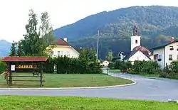The first church was mentioned at the site in 1544, but this was replaced by a late Baroque structure designed by Lovrenc Prager (1728–1791) and built from 1762 to 1772.[4][7] It is a single-nave hall church with three arched segments, a square chancel, and a more recent bell tower. The main altar is from the second half of the 18th century, and the two side altars from the 19th century. On 12 March 1943 the Partisans burned down the church and dynamited the bell tower.[8][9] The church is registered as cultural heritage.[10]