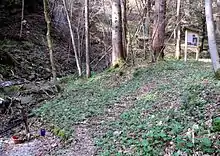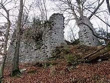 The ruins of the oldest castle in the Skofja Loka region stand just east of Gabrovo at an elevation called Stari grad 'old castle' (502 meters or 1,647 feet). The castle, originally named Wildenlack,[4] dates back to the 12th or 13th century and was first mentioned in written sources in the 14th century. The remnants of the surrounding Romanesque wall and the foundations of other structures are visible at the site.[5][6]