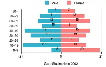 According to the 2002 Poland census, there were 223 people residing in Gace Słupieckie village, of whom 49.8% were male and 50.2% were female. In the village, the population was spread out, with 20.6% under the age of 18, 33.6% from 18 to 44, 18.4% from 45 to 64, and 27.4% who were 65 years of age or older.[1]