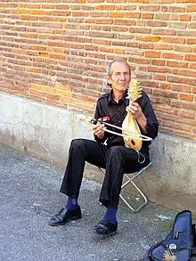 The gadulka (Bulgarian: гъдулка) is a traditional Bulgarian bowed string instrument. Alternate spellings are "gǎdulka", "gudulka" and "g'dulka". Its name comes from a root meaning "to make noise, hum or buzz". The gadulka is an integral part of Bulgarian traditional instrumental ensembles, commonly played in the context of dance music.[3]