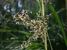 The flowers grow in spikes from the centre of the plant and appear in spring and summer. They are followed by shiny dark brown to black nuts, which measure 2.5 to 3.5 mm (0.098 to 0.138 in) long and 1.5 to 2 mm (0.059 to 0.079 in) in diameter.[1] The specific epithet melanocarpa translates from the Greek meaning "black fruit".[2]