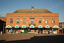 The new building was designed by Meeke and Bramall in the Italianate style, built in red brick with stone dressings at a cost of £3,250 and completed in 1892.[3] The design involved a symmetrical main frontage with eight bays facing onto the Market Square; the central section of two bays featured two round headed windows on the ground floor with a single large round headed window on the first floor flanked by pilasters supporting a pediment containing a clock in the tympanum. There were doorways in the third and the sixth bays. The left and right sections, which contained round headed windows on the ground floor and sash windows on the first floor, were also flanked by pilasters supporting pediments at roof level. Internally, the left hand section contained retail units and a butter market, while the right hand section contained the council chamber.[1][4]