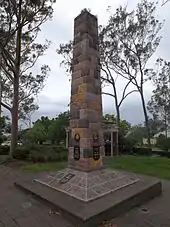 The memorial is situated near the western corner of the park at the top of a grassy avenue flanked by hedges and eucalypt trees. It is in the form of an obelisk, 20 feet (6.1 m) high and square in section composed of coursed blocks of Brisbane tuff (porphyry). It is set on a sloping plinth faced with masonry tiles and is surrounded by a paved area. Bronze memorial tablets beneath bronze laurel wreaths are set low on the sides of the shaft. These are inscribed "In Memory of Fallen Comrades" with the dates beneath commemorating the First and Second World Wars and the Korean, Malaya, Vietnam and Borneo conflicts. The fourth plaque commemorates the dedication of the memorial and is inscribed "Unveiled by his Excellency the Governor of Queensland Lieutenant General Sir John Laverack KBE, CB, CMG, DSO and dedicated by Reverend A G Reilly on 25 April 1951".[1]
