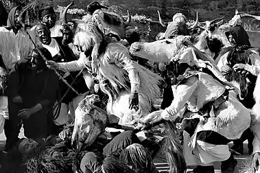 The meaning of this representation was a hope of the whole community: wild nature dancing at the rhythm they wanted (with regular rains etc...). This representation ends with good characters hardly beating and killing the bad character (because of his refusal to follow the rhythm). It is the end of winter and the beginning of celebrations involving the whole community. However, while these big celebrations are having place, the bad character raise again and begins attacking everybody, once more. This was to remind the community that they do not have to celebrate too much: their win is only a temporary win and next year a new fight will be required to survive.