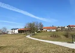 Gajniče is a clustered village on the southern slope of Roj Hill (330 m), which also has a railroad tunnel. A wet, marshy valley lies below the village, through which Tlake Creek (Slovene: Tlaški potok) flows, with its source at Vir Spring below the hamlet of Razdrto. The creek flows through the low-lying Snožeti Meadows.[5] Klobušter Hill (396 m) and Mačka Hill (397 m) rise above the settlement to the south.[6][7]